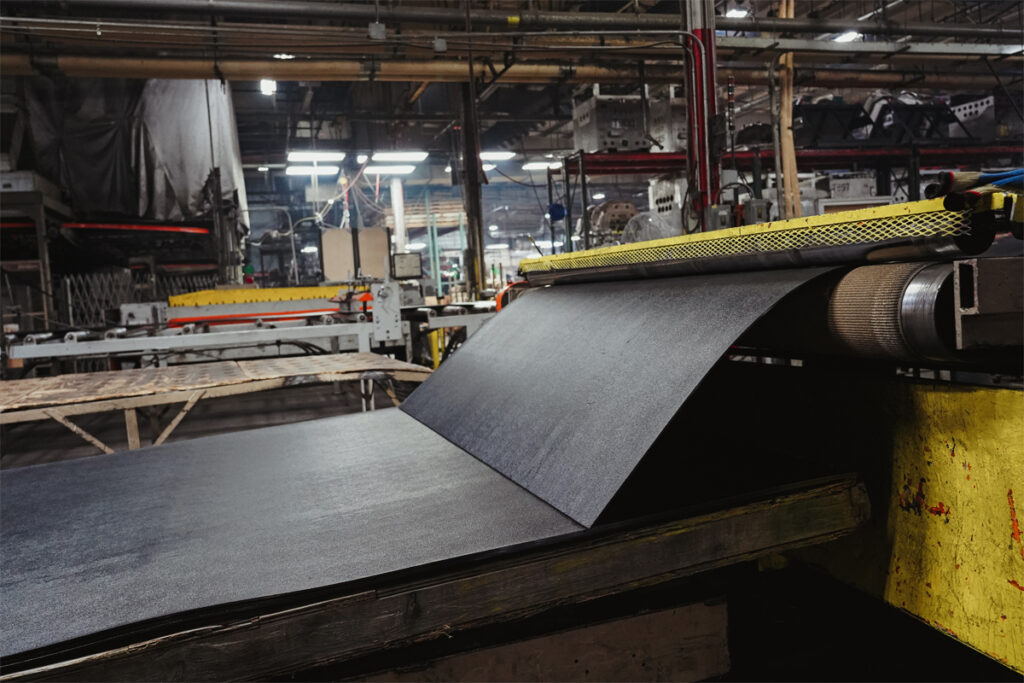 Most of the sheeting we produce here is a black colored sheet. Therefore, our specification and industry standard is 1% carbon black in our final product. A lot of the materials that go into our blend are black already, so it doesn’t take much colored concentrate to create a uniform look. Silos outside of our facilities feed virgin resin into the extruders as part of the material blend as well, which we source externally. Material from the pelletizer also goes into the extruded sheet, and this material consists of carefully controlled virgin resin and regrind plastic that is blended and compounded in-house.